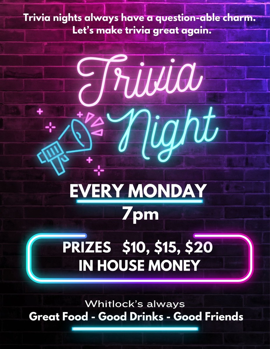 Trivia night always has questionable charm... Let's make trivia great again! In house money! Prize $10 $15 $20